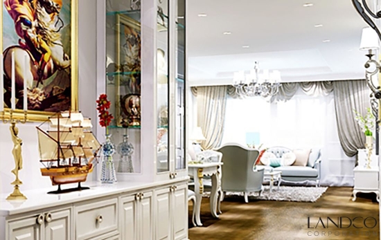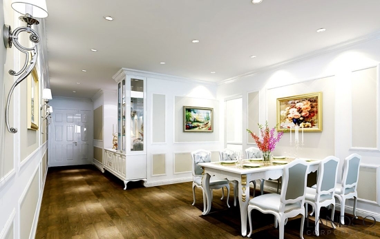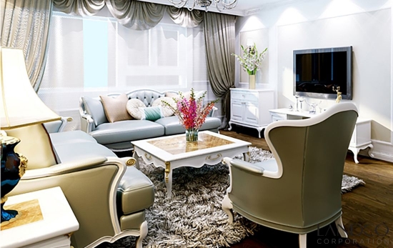 Đoàn Hường – designer of LANDDECOR, đã khởi tạo không gian cổ điển tông màu trắng nhã nhặn mà thanh thoát này cho căn hộ chung cư Hapulico bằng những gam màu nhẹ như trắng, xám, be và không thể thiếu nhũ vàng quyến rũ. Gam màu trắng cũng giúp cho không gian căn hộ như thoáng rộng hơn tránh cảm giác nặng nề, rối mắt từ đường nét hoa văn cầu kỳ. Đồ nội thất theo phong cách Louis XV nổi bật bởi những đường cong như chân đế cong mảnh mai, tay ghế, lưng ghế cong mềm mại khắc họa vào không gian sự trang nhã, thanh lịch.
