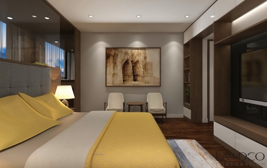 Hệ thống phòng ngủ trong nhà đồng nhất thiết kế với đặc trưng là ánh sáng, là bàn ghế, tranh treo tường đồng sắc và sàn gỗ tạo cảm giác sang trọng, tinh tế. Các chi tiết gỗ cũng được kết hợp khéo léo với tủ gỗ nối tiếp giường ngủ và không gian tường gỗ trầm đem lại sự bí ẩn tràn đầy.