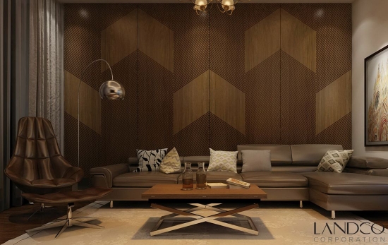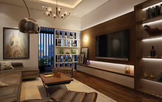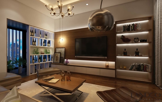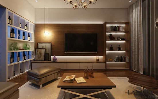 Phòng khách tạo ấn tượng cho khách tới chơi nhà với gam màu gỗ nâu trầm ấm quyến rũ cùng sự kết hợp ánh sáng vô cùng độc đáo. Sắc vàng của đèn chùm và hệ thống đèn led âm trần tạo cảm giác mới lạ về ánh sáng cho gia đình gia chủ. Sự đồng bộ giữa các chi tiết phối cảnh trong phòng khách giúp không gian được nối tiếp và xuyên suốt. Việc kết hợp tranh treo tường đồng sắc trong kiến trúc phòng khác cũng tạo ra sự thân thiện và kết nối không gian gia đình.