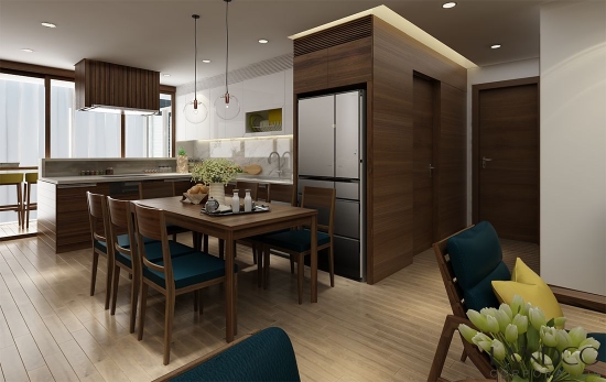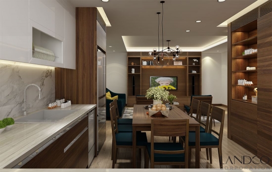 Gian bếp sử dụng tone màu trắng nâu đan xen hài hoà. Phòng khách, bếp và phòng ăn với thiết kế mở, liên thông nhau tạo sự kết nối liền mạch, mang lại sự gần gũi cho căn hộ.