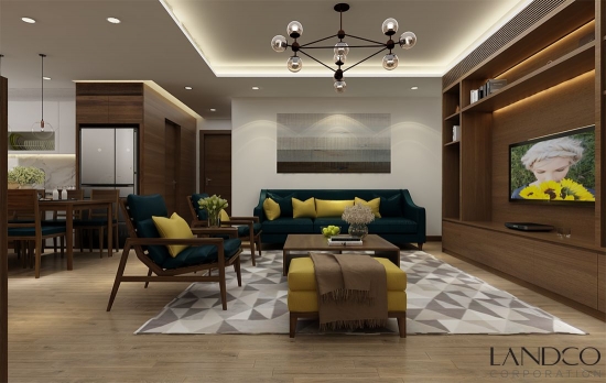 Cuộc chơi sắc màu bắt đầu từ phòng khách với bộ ghế sofa xanh ngọc lạ mắt, điểm trên đó là những gối vàng cùng tone màu đôn ghế tạo nên điểm nhấn nổi bật tại trung tâm không gian sinh hoạt chung. Kế đó là sắc trắng tinh khôi của rèm cửa, tranh trang trí, thảm khối hình học, ánh điện của đèn chùm đèn kệ,...liên tiếp tạo thành chuỗi những điểm bắt mắt trên nền màu trung tính. Bên cạnh đó, nội thất được thiết kế và chọn lọc kỹ lưỡng với đường nét, hình khối hiện đại tạo nên một tổng thể không gian sống đẹp đầy cá tính.