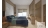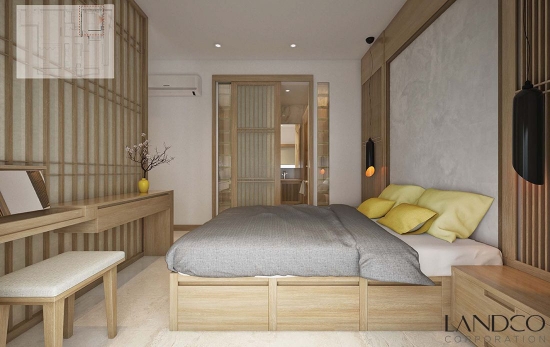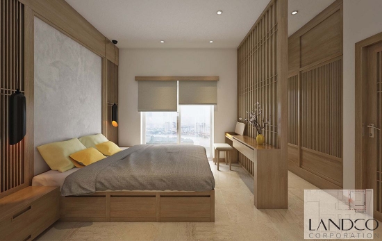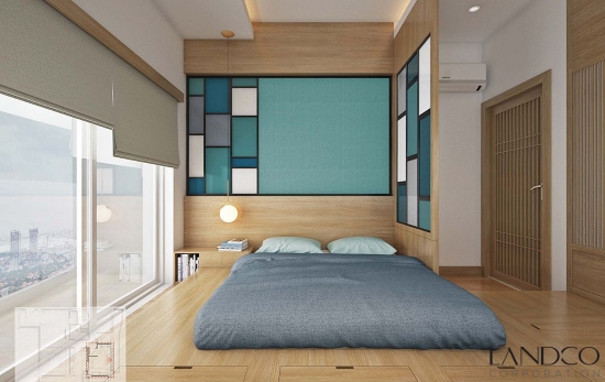 Căn hộ có hai phòng ngủ. Phòng ngủ của con có màu sắc ngọt ngào và ở đây, màu xanh trở thành chủ đạo chứ không còn mang tính điểm nhấn như ngoài không gian chung. Phòng ngủ chính được lựa chọn như một giải pháp không gian nhằm đem lại sự thỏa mãn lớn nhất cho chủ đầu tư khi hướng tới chủ đề cuộc sống tươi đẹp: tận dụng tối đa tầm nhìn đẹp và ánh sáng tự nhiên, bàn làm việc kết hợp với không gian mở, khu vệ sinh và thay đồ được ngăn cách với khối ngủ bằng tấm gỗ, có vai trò như một vách ngăn nhẹ, vẫn giữ được sự thông thoáng và tính kết nối với khối ngủ.